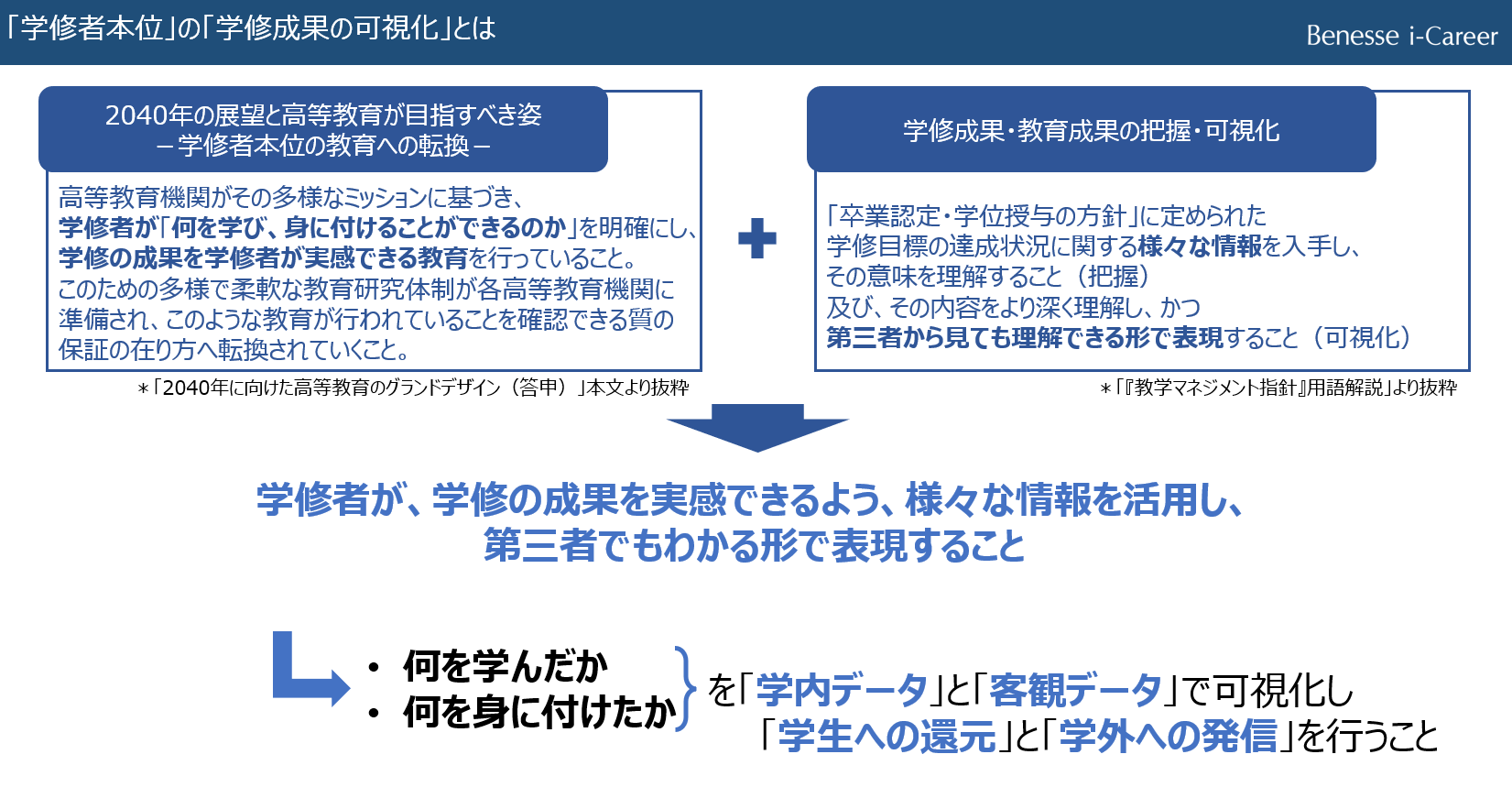 「学修成果の可視化」については、多くの大学様にとって関心の高いテーマです。特に、2025年からの第4期認証評価では、「学修成果を可視化するだけでなく、改善の議論や具体的な施策に繋げる」ことが求められています。