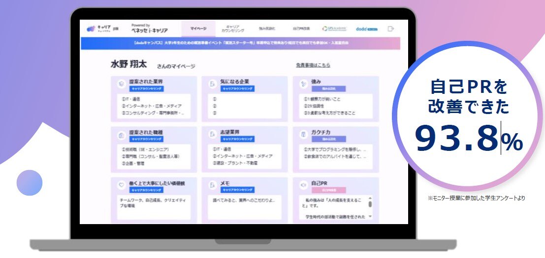 株式会社ベネッセi-キャリアのキャリアチュートリアルは、学生ひとりひとりが、「自分にあった進路選択の一歩目」を踏み出すための、個別最適なキャリア教育・指導を実現するキャリア教育用アプリです。