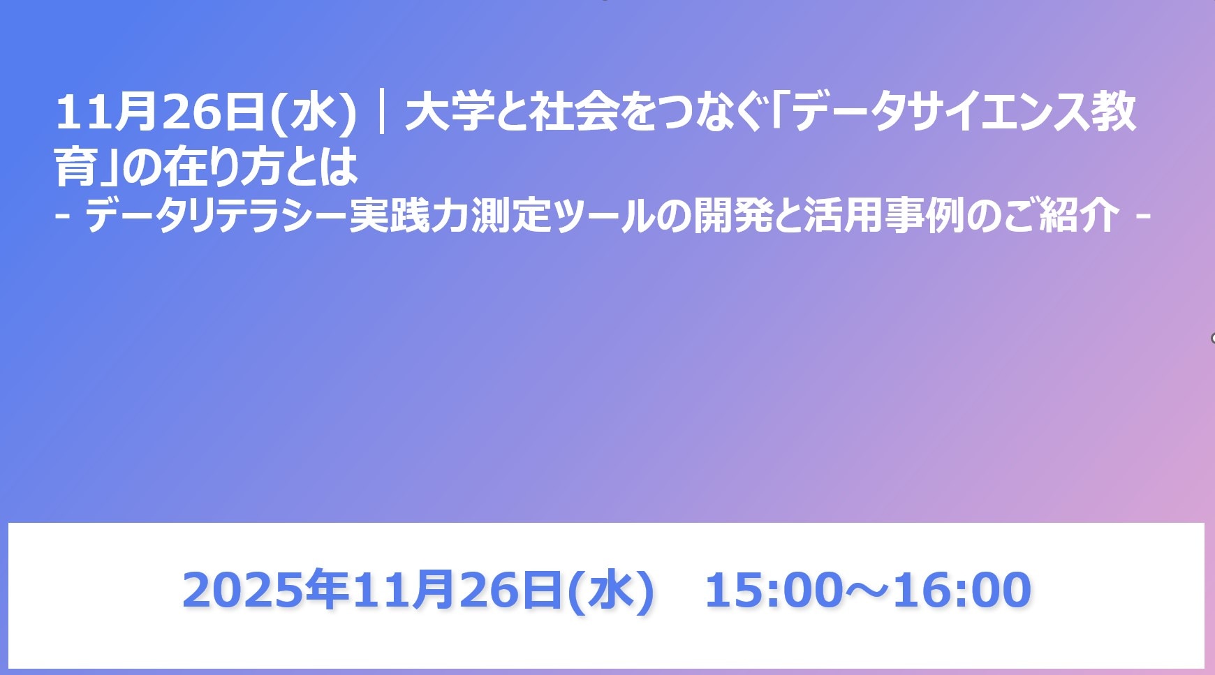 11月26日(水)|大学と社会をつなぐ「データサイエンス教育」の在り方とは- データリテラシー実践力測定ツールの開発と活用事例のご紹介 -